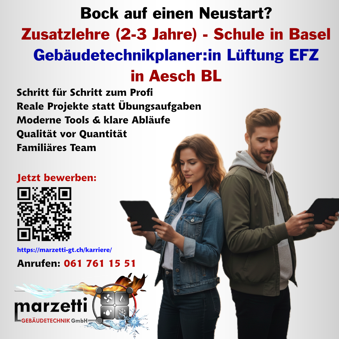 Du möchtest Gebäudetechnikplaner/in lernen und suchst eine Lehrstelle (auch Zusatzlehre) mit Praxis, persönlicher Betreuung und spannenden Projekten?